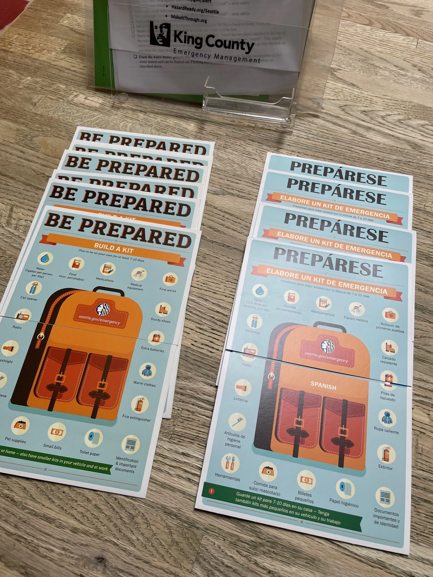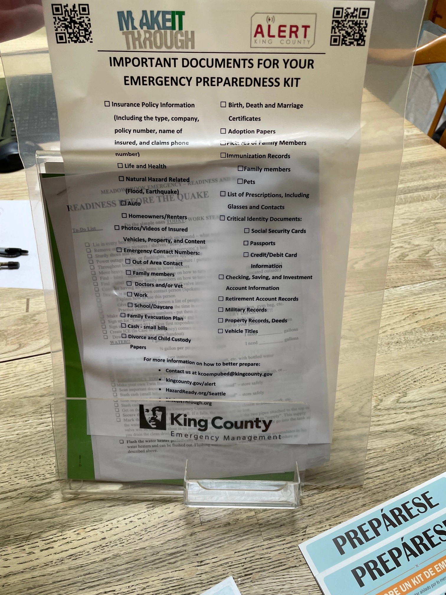 We had a table set up with information about Emergency Hubs, explaining what they are and where they are locally. The King County Office of Emergency Preparedness provided us with 50 zip-lock like bags, which featured a list of important documents for an emergency preparedness kit on it and stuffed with some related documentation. They went fast!