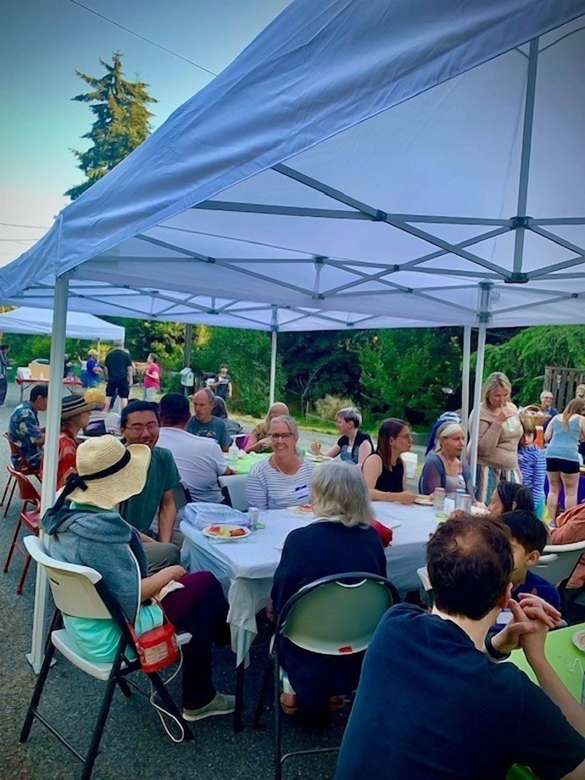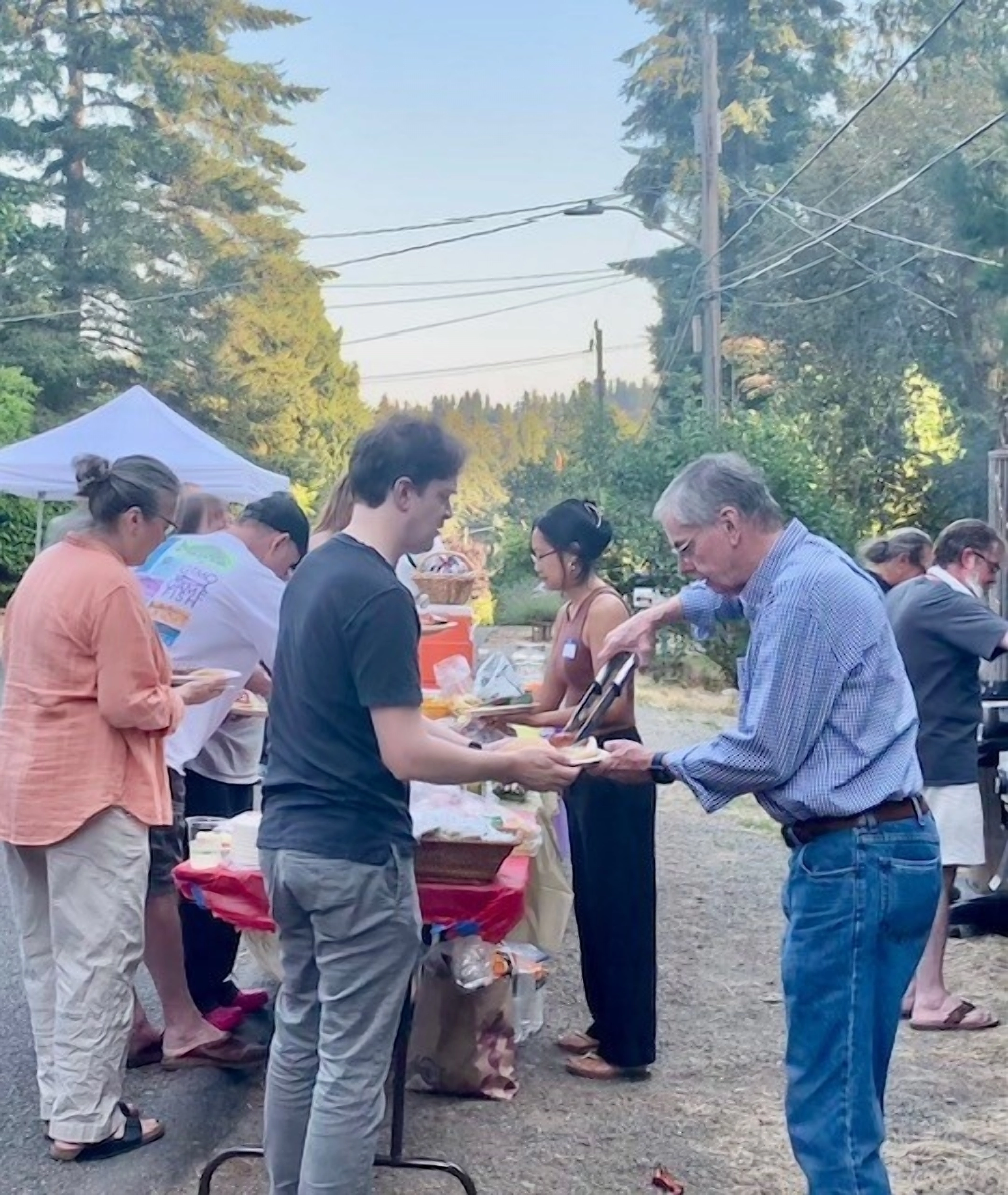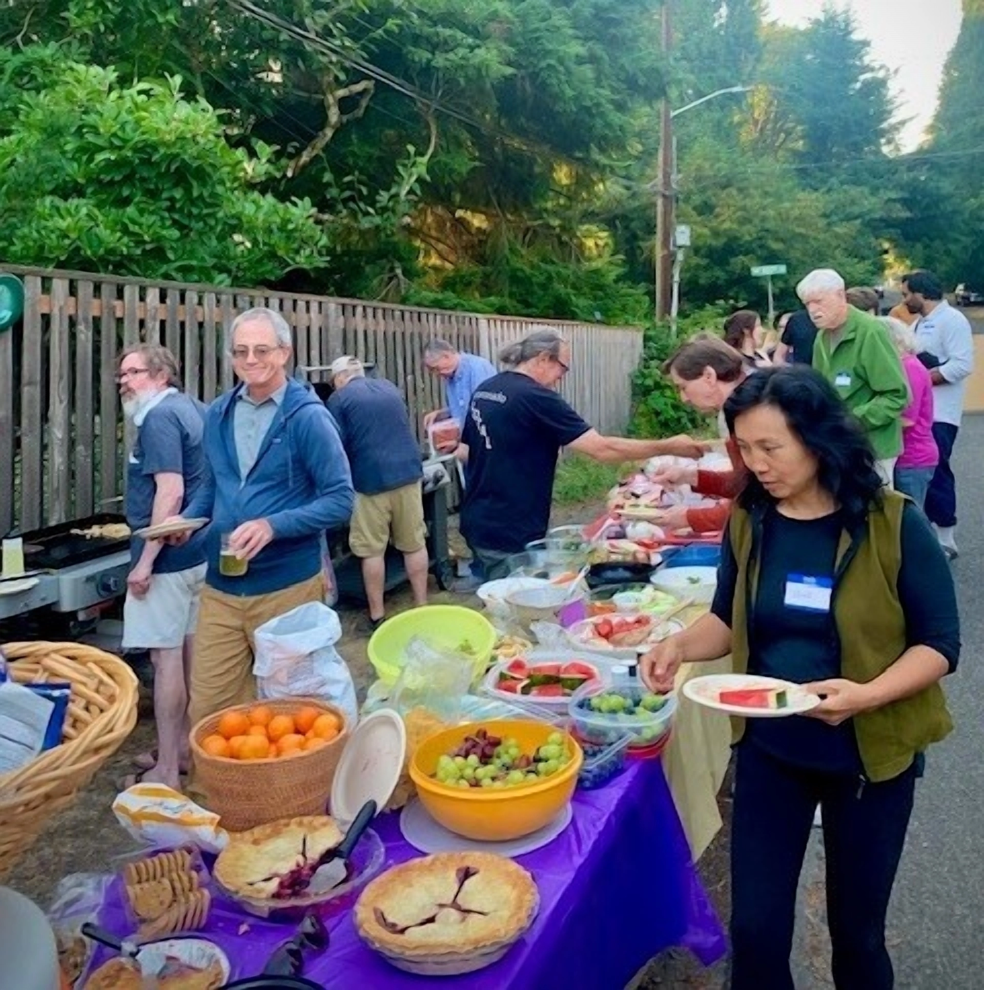 Night Out 2024 featured three grills, providing separation for different food requirements. We announced on the invitations that we were providing basic BBQ staples as a part of our grant, such as hot dogs, beef burgers, veggie burgers, grilled vegetables, still and sparkling waters, and freshly squeezed lemonade, while encouraging neighbors to bring dishes to share potluck style. The neighbors did not disappoint! Fruits, various salads, cooked and raw vegetables, noodle dishes, and several desserts covered the 15 feet of tables that were set up for that. It was diverse and delicious. The pies went fast!!!
