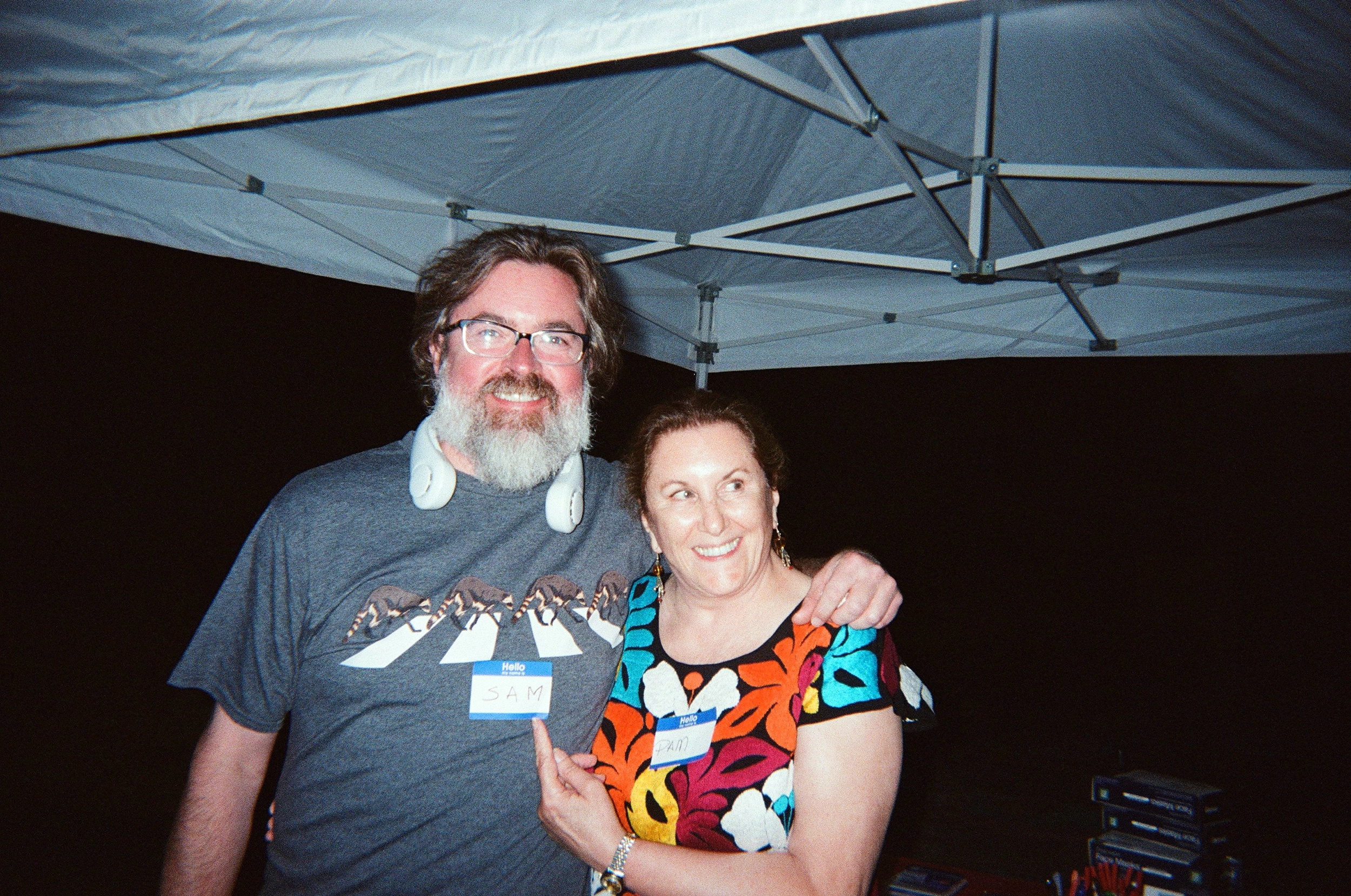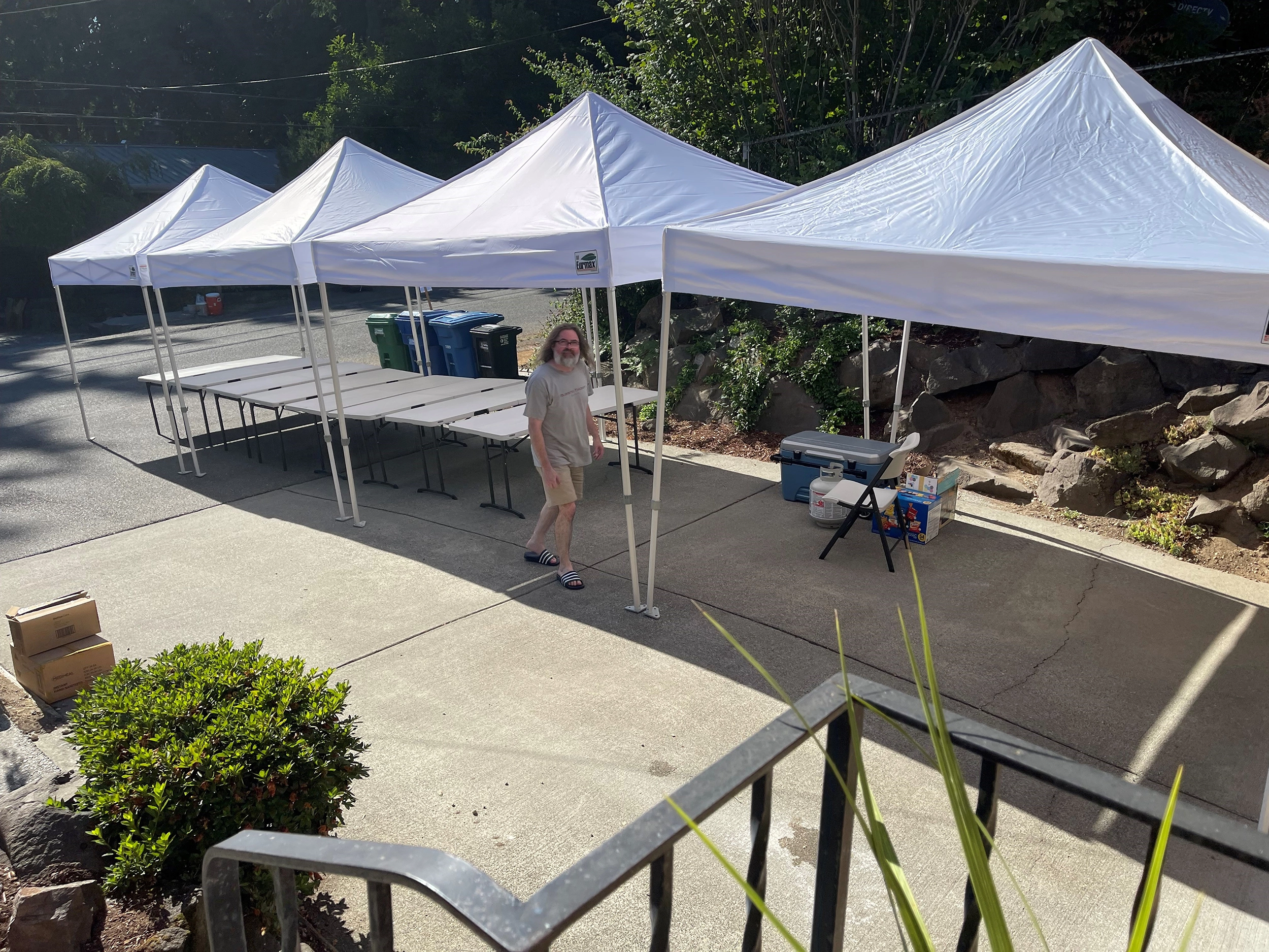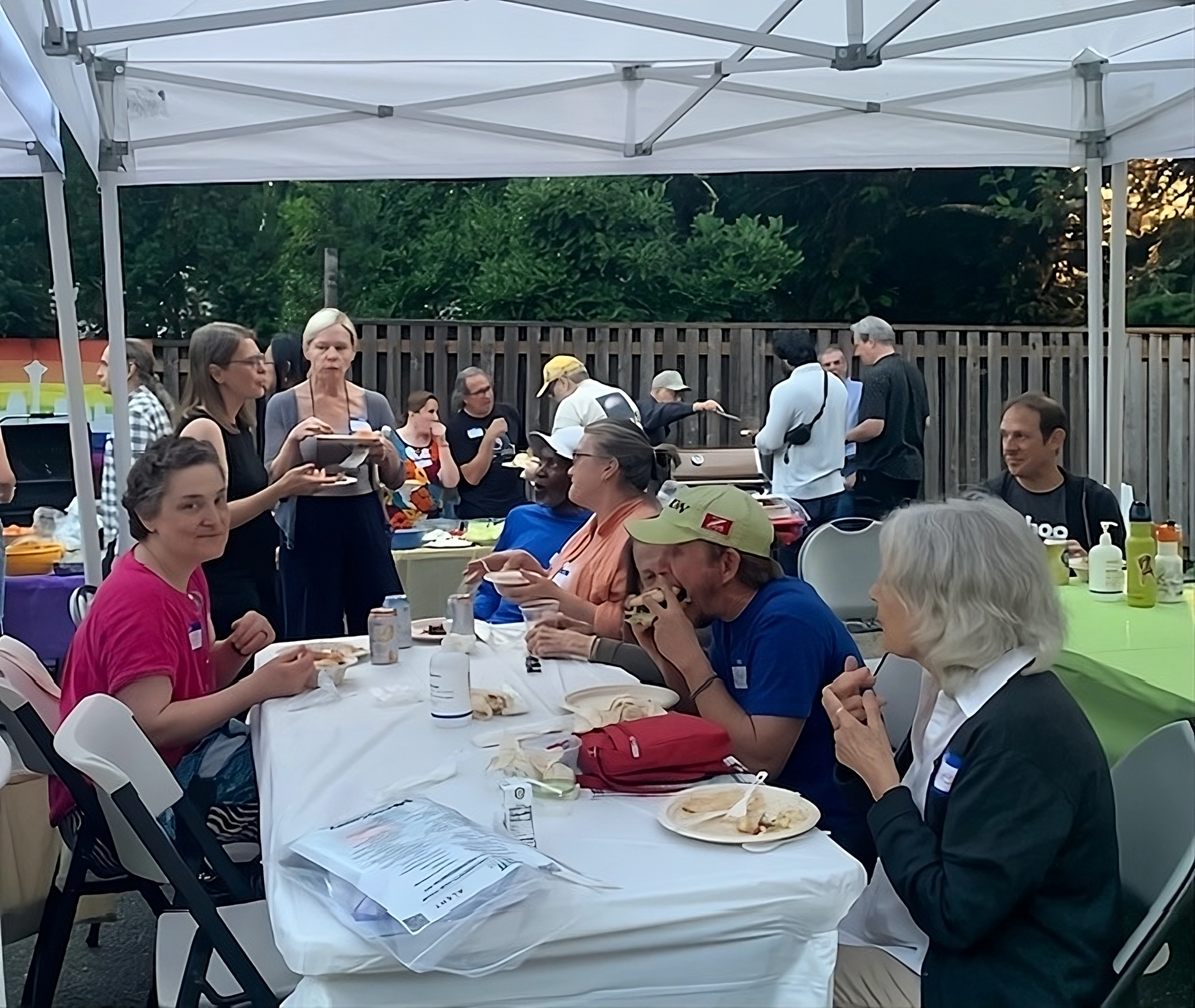 Night Out 2024 featured three grills, providing separation for different food requirements. We announced on the invitations that we were providing basic BBQ staples as a part of our grant, such as hot dogs, beef burgers, veggie burgers, grilled vegetables, still and sparkling waters, and freshly squeezed lemonade, while encouraging neighbors to bring dishes to share potluck style. The neighbors did not disappoint! Fruits, various salads, cooked and raw vegetables, noodle dishes, and several desserts covered the 15 feet of tables that were set up for that. It was diverse and delicious. The pies went fast!!!